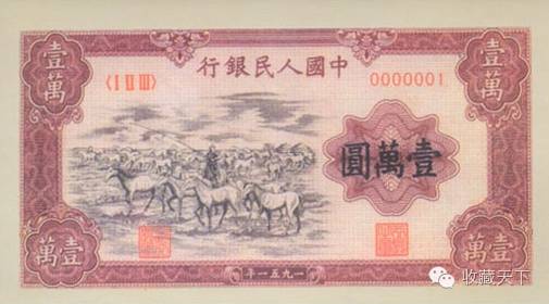 1)第一套人民币币王:牧马图,是第一套人民币中的壹万圆牧马券,票面左侧为牧马图,发行于1951年5月17日,1955年4月1日停止流通。在第一套人民币中价格最高,约为第一套大全套价格的50%左右。