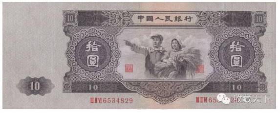 2)第二套人民币币王:大黑10,1953年10元纸币,因为整体花纹颜色呈墨黑色,为加长版,因此也被称为“大黑拾”。正面图案是“丰收图”,图案是怀抱稻穗的女农民和头戴鸭舌帽的男工人,寓意为中国工农阶级当家做主,拥抱全新的生活,背面为各民族文字图案。大黑拾是新中国成立时的见证,具有较深刻的历史意义,因此在钱币收藏市场备受看中时代价值的藏家的青睐。